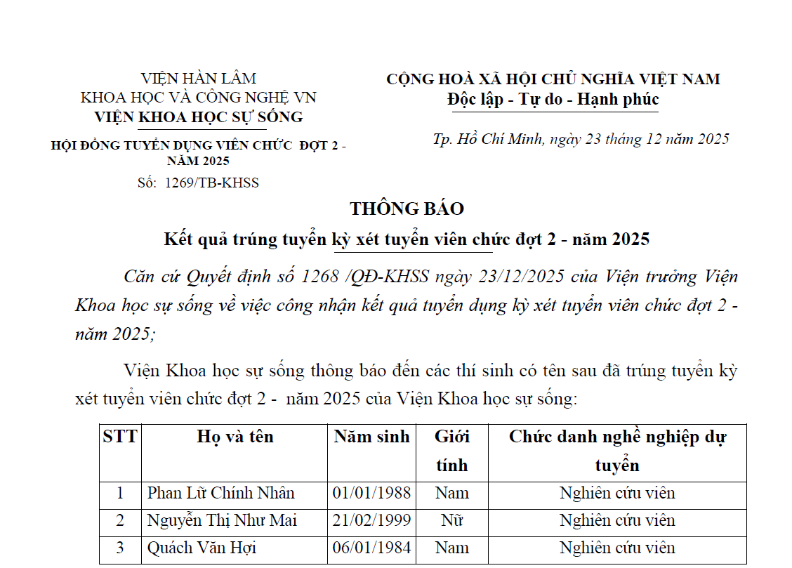 THÔNG BÁO Kết quả trúng tuyển kỳ xét tuyển viên chức đợt 1 - năm 2025
